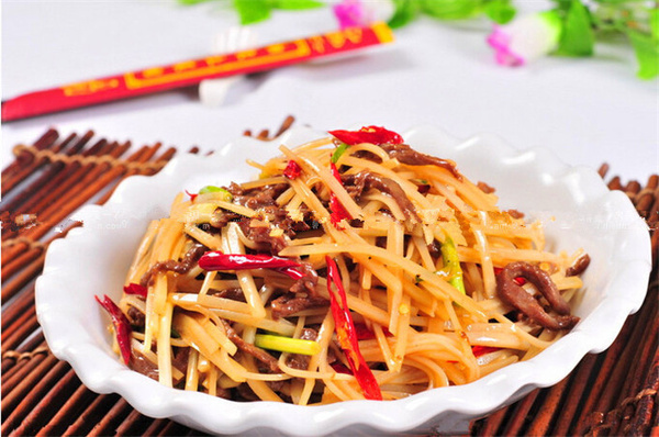 1、将牛肉自横断面切成丝,将团粉、酱油、料酒调汁浸泡牛肉丝。土豆洗净去皮,切成丝。